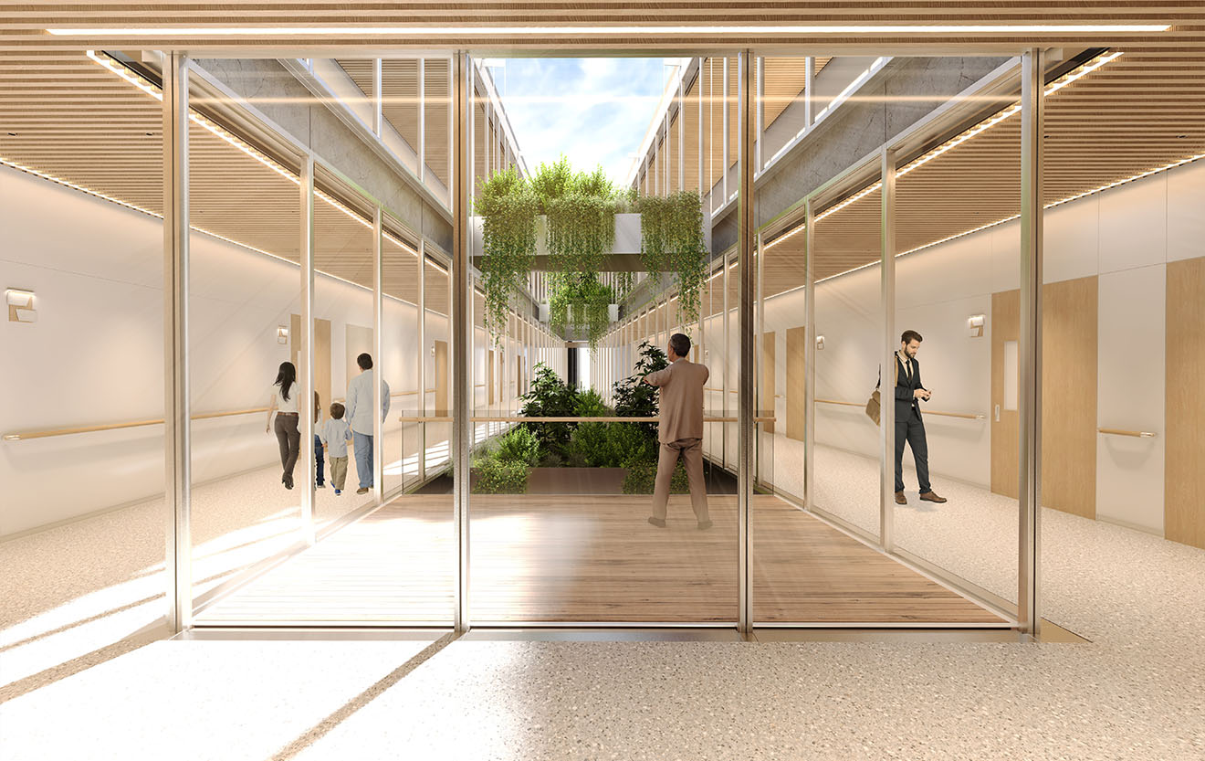 The architecture is composed of a series of gently staggered volumes, forming internal courtyards open to the sky. These courtyards bring sunlight and greenery deep into the building. Fluid corridors extend between volumes, softly linking different functional zones while encouraging everyday encounters with nature. Light, air, and vegetation are not background elements but central components of the spatial experience, interacting directly with daily life and healing processes.