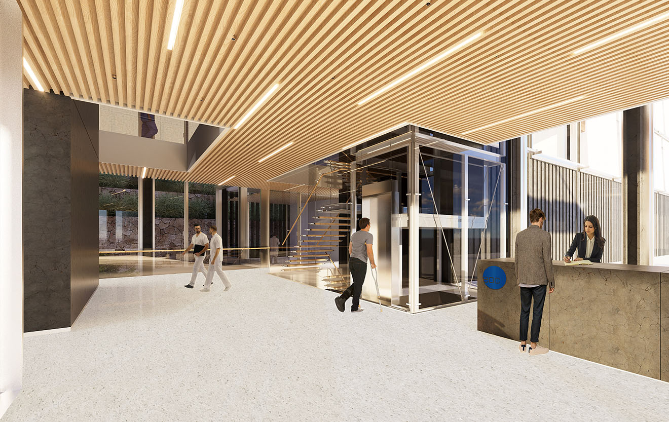 The architecture is composed of a series of gently staggered volumes, forming internal courtyards open to the sky. These courtyards bring sunlight and greenery deep into the building. Fluid corridors extend between volumes, softly linking different functional zones while encouraging everyday encounters with nature. Light, air, and vegetation are not background elements but central components of the spatial experience, interacting directly with daily life and healing processes.